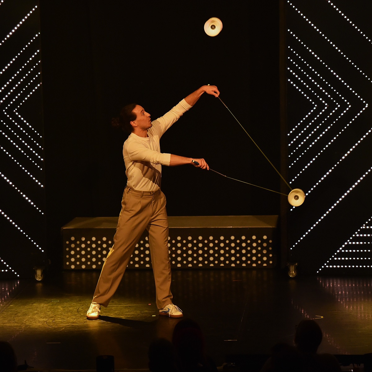 Mit spielerischer Leichtigkeit kombiniert Martin Regouffre anspruchsvolle Diabolo-Jonglage mit Akrobatik – beweglich, lebendig, voller Dynamik.