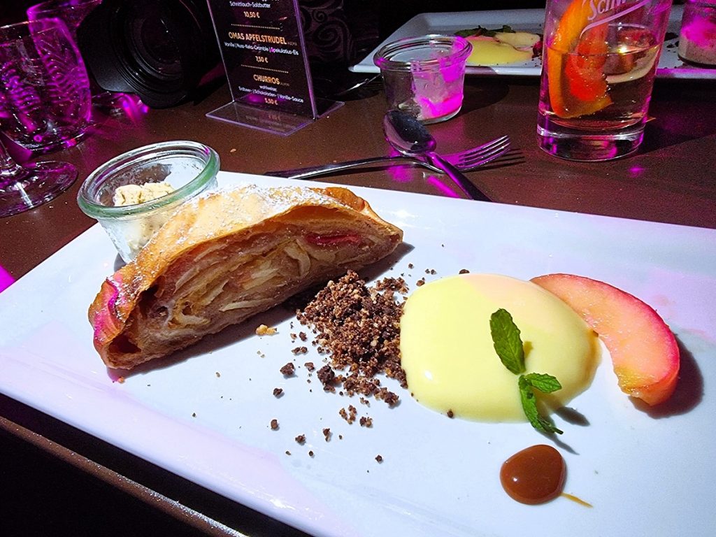 Dessert (bei 3-Gänge): „Omas Apfelstrudel“ mit Vanille, Nuss-Keks-Crumble und Spekulatius-Eis.
