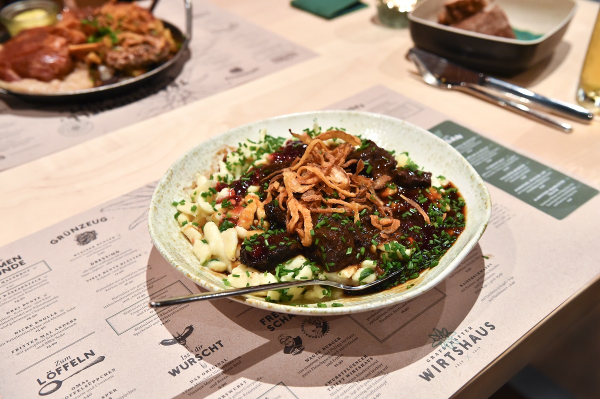 Das Hirschgulasch war butterzart, mit einer aromatisch-würzigen Sauce, herbstlicher Genuss pur. Ich habe mich sehr gefreut, als ich das Gericht auf der Oktober-Sonderkarte entdeckt habe, denn Wild bekommt man nicht überall und auch nicht immer.