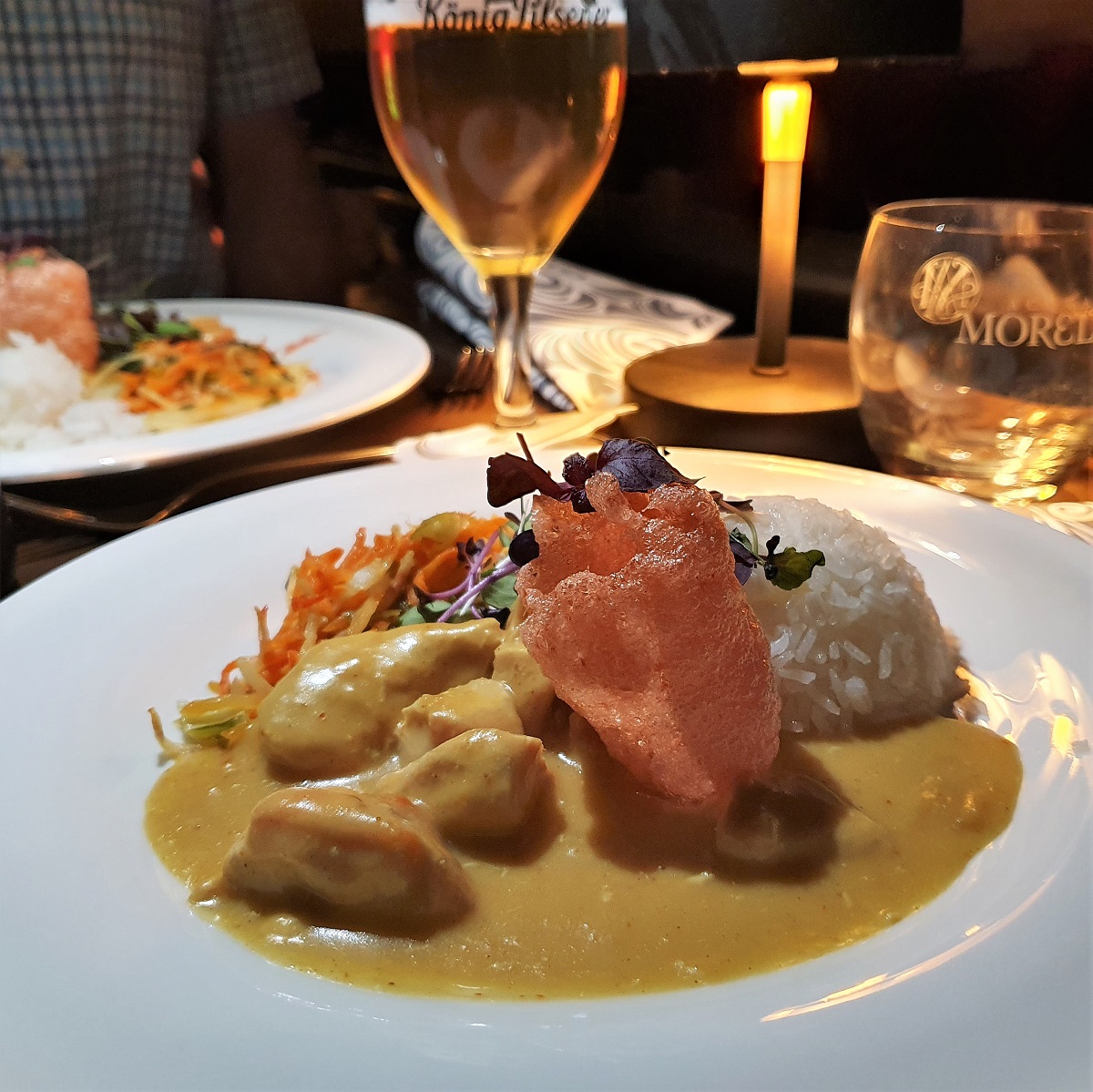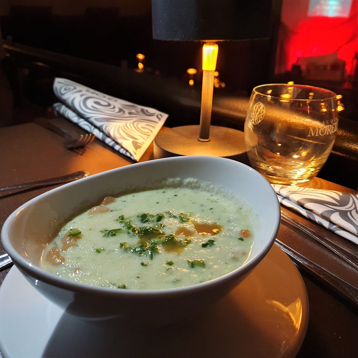 Das 3-Gänge Menü besteht dieses mal aus einer Kaltschale und einem milden Thai-Curry. Alternativ kann man sich auch für Rote Bete Gnocchis entscheiden.